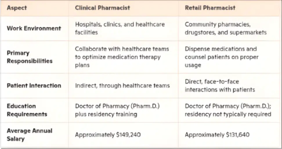 Retail pharmacists typically operate in fast-paced, customer-facing roles, while clinical pharmacists work in collaborative, medically focused pharmacist work environments where they provide direct patient care and support